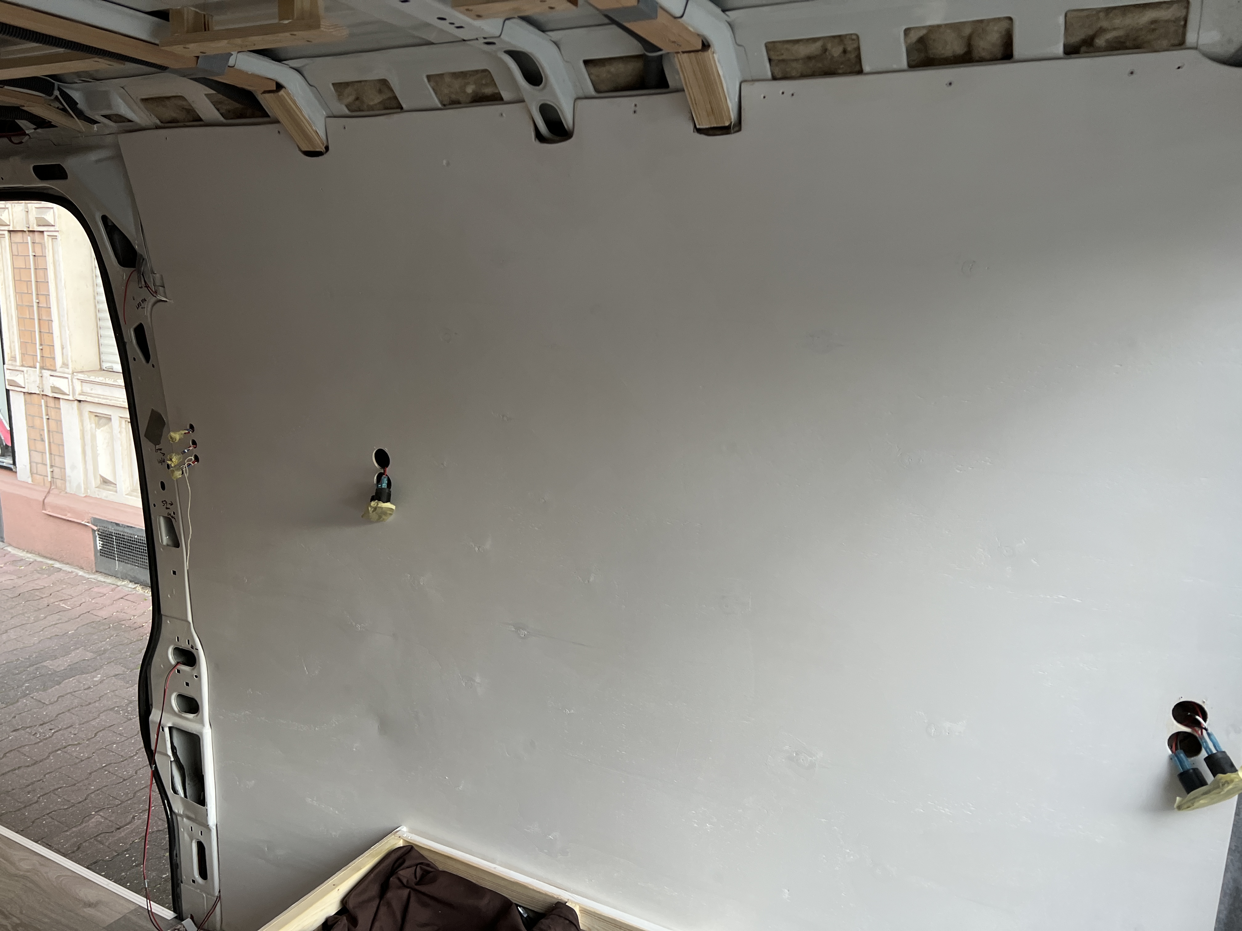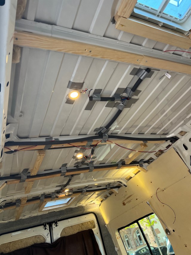 Once we were happy with the proof of concept the next step was to start laying the wiring along the walls and ceiling. This would be done using plastic ducting to house the wires so that they would not be in direct contact with the sheep-wool insulation we would be inserting between the walls and external skin of the van.